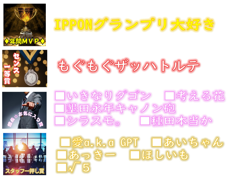年間MVP: 商品券3,000円分(1名)センス一等賞: 商品券2,000円分(1名)館長お気に入り賞: 商品券1,000円分(5名)スタッフ一押し賞: 商品券500円分(5名)