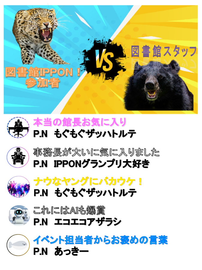 リワード詳細「本当の館長お気に入り」 図書館長からの得点が最も多かった者「事務長が大いに気に入りました」 図書館事務長からの得点が最も多かった者「ナウなヤングにバカウケ!」 20代~30代の若手スタッフからの得点が最も多かった者「これにはAIも爆賞」 ChatGPTからの得点が最も多かった者「イベント担当者からお褒めの言葉」 担当者が一番「おっ!」と思った回答を出した者