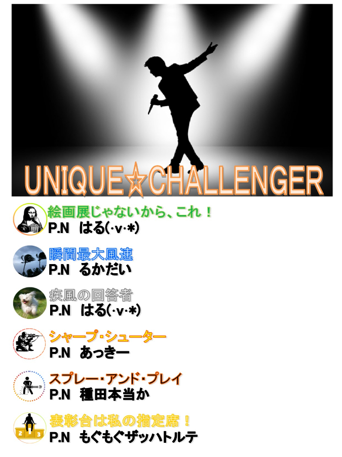 リワード詳細「絵画展じゃないから、これ!」 回答中、最も文字だけでなく絵なども駆使した者「瞬間最大風速」 全回答の中で最も獲得点が多い回答を出した者「疾風の回答者」 毎月の回答で1番目の回答を獲った回数が最も多い者「シャープ・シューター」 3回以下の少ない参加回数の回答者中、最も点数が多かった者「スプレー・アンド・プレイ」 年間累計投稿数が最も多かった者(複数名の場合、総獲得点が一番低い者)「表彰台は私の指定席!」 毎月の上位3作品の発表で一番掲載された月が多かった者